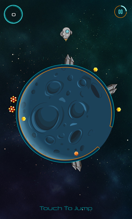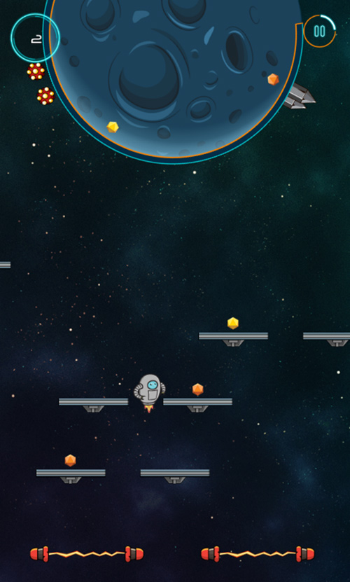 Tap the screen to fire your robot's thrusters, and make your way through the levels. Rather than jumping through levels, you will guide your robot downward by firing its thrusters to control your descent. Collect yellow, orange, and red ions, but avoid the other obstacles and traps. You'll find power-ups scattered throughout the levels, especially near some of the more challenging sections.